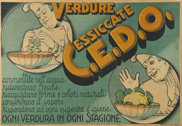 | Note | Il manifesto pubblicizza le verdure essicate della ditta C.E.D.O. e lo fa ricorrendo ad una grafica esuberante in cui vengono utilizzati un lettering imponente, un testo sull'utilizzo e sulle qualità del prodotto - che sembra ricalcare la pagina del quaderno di ricette di una qualsiasi casalinga italiana - e due immagini vivaci in cui un cuoco, figura atta a conferire ulteriore credibilità all'articolo pubblicizzato, che mostra l'efficacia quasi "miracolosa" del prodotto. Il cucinare negli anni Trenta rappresenta il riflesso della profonda esigenza di modernizzazione dell'epoca. Mai come in quegli anni il fenomeno culinario ha avuto una dimensione ideologica, poiché la società assegnava alla gastronomia un valore politico e un ruolo strategico. Ma, oltre ad una tendenza innovatrice, perdurava nel contempo una linea di pensiero contraria alle influenze internazionali che avevano compromesso la cucina italiana. Si scriveva, all'epoca, nella rivista Cucina Italiana, nata a Milano nel 199: "Quello che rovina la cucina è la facilità con cui le signore, e le cuoche, possono procurarsi salse già elaborate, condimenti preparati in serie, etc... Ed è l’andazzo, che noi abbiamo derivato, come tutte le cose meno simpatiche, dagli stranieri (perché la cucina italiana è, come tutto ciò che è nostro, fondamentalmente sana, buona, saporosa e piacevole) di snaturare il sapore, diciamo così, degli alimenti. Se voi fate arrostire un pezzo di vitello, e ci mettete sopra, o accanto, una salsa che “non ci dice”, voi commettete una crudeltà inutile verso quel povero vitello, che si domanderà sbigottito perché mai l’hanno fatto morire, per dargli quei dispiaceri. [...] E un’altra cosa dovreste fare: non lasciarvi mai sedurre dai cibi fuori stagione. Certo, è molto chic dare a un pranzo, in novembre, dei cibi primaverili. Ma o son primizie venute fuori per forza, nelle serre, o è roba comunque conservata. In ogni modo non ha sapore." |