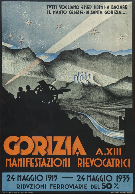 | Note | Manifesto realizzato in occasione delle manifestazioni rievocatrici organizzate a Gorizia nel luglio del 1935. Presenti nell'affiche i principali emblemi del capoluogo isontino, terra di sanguinose battaglie avvenute nel corso del primo conflitto mondiale. In primo piano, tinte dal cupo colore dell'ombra, le sagome di due soldati accanto ad un minaccioso cannone, ed oltre la collina su cui giace, minaccioso e minacciato, il medievale maniero dietro al quale si stagliano i tristemente noti colli segnati da feroci combattimenti. Tra queste alture, nella valle, scorre il fiume Isonzo, anch'esso scenario di penosi avvenimenti. Simboli di dolore ma anche di rinascita, di cui il manto celeste che li sovrasta ne è foriero. Tra le brillanti stelle che lo infervorano, un verso tratto da una poesia di Vittorio Locchi, La Sagra di Santa Gorizia. Il poema segue passo passo, attraverso le stagioni, alcune compagnie di fanti stanziate nella zona del Basso Isonzo. Il culmine della narrazione è rappresentato dalla notte del 7 agosto, data dell'azione militare che condurrà l'esercito italiano dentro Gorizia. |