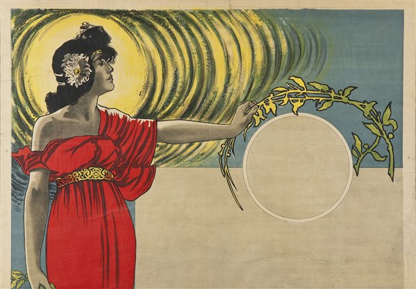| Note | Il bozzetto, relativo probabilmente alla parte superiore di un manifesto, riprende i principali tratti distintivi dell'Art Nouveau, con uno sguardo particolare rivolto al secessionista Alphonse Mucha i cui lavori spesso raffigurano giovani donne in abiti dal taglio neoclassico, circondate da motivi floreali che formano cornici geometriche attorno alla figura. L'opera, attribuibile ad Antonio Bauzon, mostra una giovane fanciulla la quale tiene in mano un ramo che appare cesellato, simile ad un prezioso oggetto di oreficeria. Alle sue spalle il cerchio di sole che diffonde una luce dorata. Bozzetto per manifesto generico, realizzato dai disegnatori dello Stabilimento Passero Chiesa decorandone una parte - solitamente gli argini a creare una sorta di cornice - lasciando liberi degli spazi che venivano redatti in secondo tempo con appositi testi, a seconda della loro destinazione (spettacoli teatrali, operistici, manifestazioni artistiche, etc.) dagli acquirenti dell'affiche. |