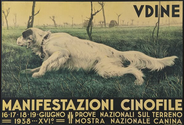 | Note | L’E.N.C.I. (Ente Nazionale della Cinofilia Italiana) fu fondato nel 1895 a Milano con lo scopo di salvaguardare le razze canine ed incrementare e migliorare il loro allevamento. In Friuli un piccolo gruppo di appassionati cinofili nel mese di luglio del 1938 dette vita al Gruppo Cinofilo Friulano. Sulla scia dell’Ente Nazionale il Gruppo Cinofilo Friulano divenne nel 1965 un’associazione di fatto. Il manifesto, dal verismo quasi fotografico, è stato realizzato in occasione delle Manifestazioni cinofile che ebbero luogo a Udine nel 1938. |