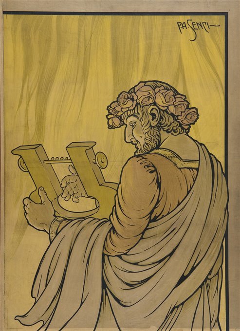 | Note | Il manifesto raffigura un uomo in abiti d'epoca classica che, corona di rose sul capo, si accinge a suonare una lira. Il soggetto, d'argomento mitologico, viene trattato secondo le tendenze stilistiche della cartellonistica degli anni '20. L'iconografia del manifesto potrebbe avere un qualche riferimento con il tema del simposio (συμπόσιον, -ου, τὸ [symposion], bere insieme) nella Grecia antica: "I greci non bevevano da soli ed il simposio si organizzava insieme divenendo dunque una forma di socialità che caratterizzava tutta la durata del mondo antico. Dopo il pasto agli uomini venivano portati acqua per lavarsi le mani, profumi e corone per ungersi ed ornarsi la testa. Le corone sono di fiori oppure di edera, pianta sacra a Dioniso". Finalità dell'affiche potrebbe essere la promozione di un evento culturale, forse un evento concertistico o teatrale. Nato a trieste il 6 luglio 1875 ed attivo nella città giuliana nei primi anni del '900, Sencig (poi Senci) si dedica soprattutto alla grafica applicata alla cartolina e a varie forme di ricorrenza o pubblicità come locandine o manifesti. Disegna per la Lega Nazionale, per la Festa del Grillo. Nel 1923 si trasferisce definitivamente a Udine ed avvia un rapporto di collaborazione con lo Stabilimento Passero-Chiesa di cui diviene il principale disegnatore "interno" conseguendo un'attività cartellonistica di un certo spessore. Si esprime con una grafica di ascendenza austriaca fatta di solido e brillante naturalismo che porta negli anni '20 ad una dimensione più popolare e a tratti fumettistica. L'artista si evolve poi verso una stilizzazione che negli anni '30 si impregna di novecentismo e raggiunge esiti di esasperata geometrizzazione. Muore a Udine il 2 novembre 1952. |