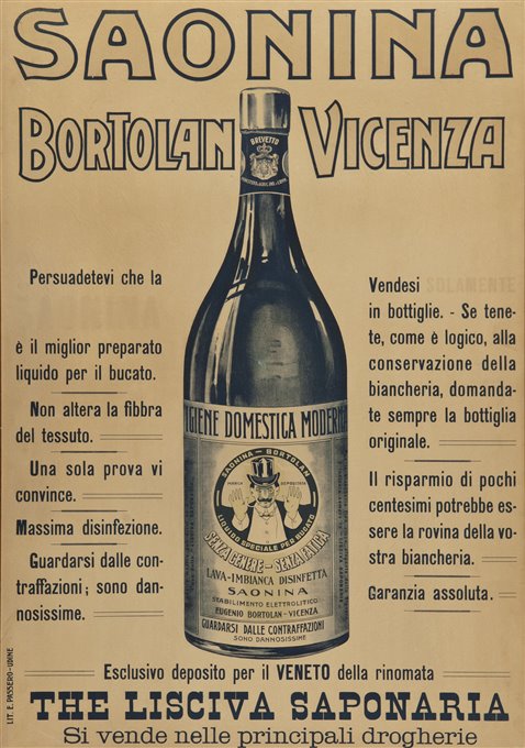 | Note | Manifesto di impianto tradizionale in cui il testo, caratterizzato da una scrittura tipografica compatta e lineare - lo slogan approderà in Italia solo attorno agli anni ’30 - ha una funzione referenziale e descrittiva ed occupa buona parte della superficie dell'affiche. Nel centro del poster campeggia, descritta in ogni suo più piccolo dettaglio, l'immagine della Saonina che presenta al pubblico il suo "testimonial", un distinto e baffuto gentiluomo in frac con cappello a cilindro, monocolo e sigaretta il quale, facendo capolino da un oblò al centro dell'etichetta, mostra le sue mani spogliate dai guanti. Esse sono candide, linde e delicate, ad indicare due tra le principali proprietà della saonina Bortolan: la pulizia e la soavità. Con la vera, originale saonina infatti - le contraffazioni sono dannosissime, così dice il testo del manifesto - non ci si sporca le mani di cenere e non ci si affatica. Altra informazione che l'osservatore ricava dalla lettura dell'affiche è la presunta provenienza estera, suggerita da una frase ben visibile, che conferisce al prodotto ulteriore fascino e credibilità. L’Italia del primo novecento ha avuto a che fare molto con l’estero attraverso certi ideali e certe merci e soprattutto attraverso i milioni di emigranti oltre Atlantico. Il riflesso dell’emigrazione nel manifesto italiano è assai sottile, se non occultato e, anche se in minima parte, tale riflesso può essere ravvisato nel manifesto della Saonina Bortolan nel quale, ai piedi della bottiglia, quasi a costituirne il sostegno, la scritta sopra citata "Esclusivo deposito per il Veneto della rinomata The Lisciva Saponaria", vuole indicare la provenienza internazionale del prodotto. Manifesto pubblicitario realizzato dallo stabilimento Passero prima dell'arrivo di Giuseppe Chiesa. |