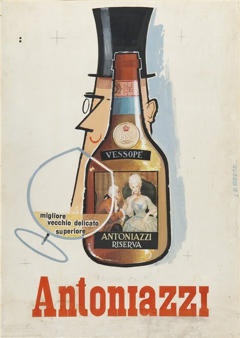 | Note | Il bozzetto, destinato alla reclamizzazione dell'acquavite prodotta dalla ditta Antoniazzi, fondata nel 1881, fa parte di quelle realizzazioni andate definendosi in special modo negli anni Trenta, appartenenti alla cosiddetta area "Foto + Grafica", nelle quali coesistevano e s'integravano gli uni con gli altri elementi vari, anche fotografici, ritagliati ed opportunamente inseriti in composizioni grafiche di base pittorica. Accanto alla bottiglia di acquavite, dalla tradizionale etichetta raffigurante una dama ed un nobiluomo in abiti settecenteschi intenti a sorseggiare l'inebriante distillato, un calice tracciato in poche linee sul quale, come incollate alla fittizia superficie in vetro, si leggono le qualità del brandy Antoniazzi riserva Vessopè, "migliore, vecchio, delicato, superiore". Retrostante la bottiglia e parzialmente nascosto da essa un uomo, o meglio, la testa stilizzata di un galantuomo, monocolo e cappello a cilindro sul capo, il cui sorriso è anticipatore del piacere che proverà nel degustare l'invitante bevanda. In questo, come in molti manifesti degli anni Trenta, si legge l'eco di tendenze figurative europee, dai razionalismi architettonici e geometrici, il cui esempio proviene dalla tedesca Bauhaus e dall'Olanda costruttivista, alle geometrizzazioni cubiste, che prevedono forme sintetiche e chiaramente leggibili. Al futurismo vanno invece riportati il dominante andamento dinamico della grafica del periodo, la semplificazione bidimensionale delle forme, la costruzione per linee diagonali e, in generale, il tono giocoso che, invece di imitare la realtà, inventa un tipo di linguaggio alternativo e ben riconoscibile. |