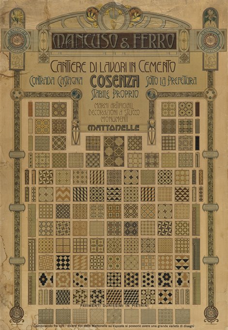 | Note | Il manifesto pubblicitario di piastrelle in cemento della ditta "Mancuso & Ferro" di Cosenza mostra, com'era in uso all'epoca, un ricco campionario di mattonelle decorate prodotte dall'azienda. Le cosiddette "cementine" in pastina colorata venivano utilizzate spesso in sostituzione dei vecchi pavimenti in argilla pressata che si trovavano nelle case dei centri abitati ed ebbero il massimo impiego tra il 1900 e il 1930, dopodichè sono state rivalutate e proposte come alternativa originale ed elegante ai pavimenti tradizionali. In realtà le cementine o pastine , così come le graniglie o marmette, fanno la loro comparsa già a fine ‘800 con l’avvento della rivoluzione industriale e, di conseguenza, con una maggiore produzione di cemento. Anche questo tipo di pavimento viene inserito nei palazzi dai primi anni del ‘900, anche perché, soprattutto in grandi città come Roma, in seguito a una forte immigrazione da diverse regioni d’Italia, iniziavano ‘fuori porta’ le costruzioni intensive di palazzi di sei, otto piani. Di conseguenza serviva un pavimento che fosse di veloce esecuzione, non come i pavimenti alla veneziana e altrettanto duraturo nel tempo, proponendo sempre un minimo di disegno, decoro e stile. Così , come le graniglie, le cementine sono composte da una base di cemento e sabbia, la loro forma, oltre essere quadrata, come le graniglie, spesso era esagonale. La posa dei pavimenti in cementine veniva effettuata a ‘toppa’ con ‘malta bastarda’(cemento pozzolanico e calce), montate una per una. |