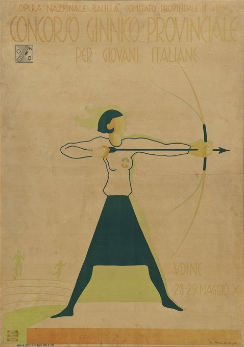 | Note | Altro settore i cui si sviluppa il manifesto italiano, e con esso un segno del vivere del paese, è quello dello sport. In realtà lo sport, qualunque esso sia, in Italia resta per molto tempo cosa quanto mai elitaria, e a livello popolare è considerato più un evento a cui assistere che qualcosa da praticare - in tal senso i manifesti sportivi sono da considerare come una grande forma di spettacolo di massa, che in molte circostanze di competizione internazionale mette in simbolico e agonistico contatto gli italiani con gli stranieri. Fin dagli inizi del XX secolo lo sport diviene quindi spettacolo che, insieme, permette di sfuggire alla città, alle sue seduzioni spesso considerate corruzioni. Anche lo Stabilimento Chiesa realizza delle affiche promozionali di eventi sportivi e nel “tradizionalismo” iconografico della litografia udinese si trovano in questo settore esempi meno convenzionali di progettazione grafica come la “giovane italiana” raffigurata da Mario Bernardinis in occasione del Concorso Ginnico Provinciale del 1932 organizzato dal Comitato provinciale di Udine dell’Opera Nazionale Balilla dove nell’atletica avanguardista – venivano così chiamati durante il regime fascista, i giovani dai quattordici ai diciotto anni inquadrati nelle organizzazioni giovanili, dell’Opera nazionale balilla prima, della Gioventù italiana del Littorio poi – si ritrovano suggestioni carpite all’avanguardia come la sagomatura segnata con precisione e la costruzione in forme geometriche definite. Sintesi e bidimensionalità attribuiscono solidità alla figura della giovane tiratrice che diviene un tutt’uno con l’ampio arco e la freccia in tensione, pronta per essere scoccata. Funzionario pubblico, insegnante, pubblicista, disegnatore, Mario Bernardinis nacque a Udine nel 1904. Diplomatosi in statistica a Padova, conseguì la maturità artistica all'accademia di Lucca. Dal 1923 al '25 frequentò lo studio del pittore L. Viani. Lavorò poi al comune di Udine. Pittore in bianco e nero e disegnatore, si espresse dapprima come caricaturista e cartellonista. Nel 1924 ebbe il primo premio per il bozzetto del re carnevale di Viareggio. Prese parte alla quadriennale di Roma. Svolse anche un'intensa attività di critico d'arte. Suoi disegni e scritti su riviste e quotidiani regionali. Morì a Udine nel 1982. |