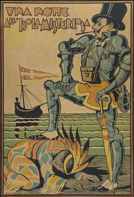 | Note | Immagine curiosa e farsesca, forse realizzata in occasione di una rappresentazione teatrale, in cui si vede uno strano personaggio che indossa un'armatura a piastre, comunemente associata ai cavalieri dell'Europa tardo-medievale, insolitamente corredata da scarpe con ghette, corto gonnellino, papillon, monocolo e cappello a cilindro. Baffetti e lungo bocchino fumante gli decorano il volto. Dispotico e arrogante - ed evidentemente in difetto d'equilibrio visto l'ombrello canarino che adopera per sostenersi - l'anomalo cavaliere appoggia la gamba sinistra, ghetta in bella vista, sul dorso di un colorato quanto prostrato indigeno piumato. In lontananza fluttua nel mare una galera dalla bandiera - simile a quelle per la segnalazione marittima - che mostra una stella a cinque punte ed un fascio littorio, simbolo del potere e dell'autorità. Il manifesto è stato vistato dalla Questura di Fiume. Manifesto attribuito ad Antonio Augusto Rubino. Nato il 15 maggio 1880 a Sanremo (Imperia), Antonio Rubino inizia a collaborare al "Giornalino della Domenica" nel 1907 e alla fine dell'anno successivo passa al "Corriere dei Piccoli", diventando in breve tempo uno dei più prolifici e importanti autori di questo popolarissimo settimanale, per il quale crea numerosi personaggi: da Quadratino a Viperetta, da Pino e Pina a Lola e Lalla, al Generale Bombarda. "Giornalista per ragazzi, favolista, autore di libretti e di commedie, decoratore di ambienti, scenografo, attore, polemista, regista di disegni animati e persino, nei ritagli di tempo, raccoglitore di olive" – così Rubino si definisce nel Curriculum ridiculum. Ma fu anche poeta, pittore, illustratore, ceramista, compositore musicale. Durante la Prima guerra mondiale collabora assiduamente a "La Tradotta", una rivista destinata ai soldati, per la quale ha tra l'altro dato vita al caporale C. Piglio, sempre pronto a elargire consigli non richiesti a chiunque gli capiti a tiro, e all'eroico Muscolo Mattia. Nel 1927 passa al "Balilla", disegnando le favole di Esopo, due anni dopo fonda e dirige "Mondo Bambino" e nel 1931 inizia una lunga collaborazione con la Mondadori, assumendo la direzione di "Topolino" dal 1935 al 1940. In seguito si dedica all'animazione, occupandosi tra l'altro de "Il paese dei ranocchi" e di "Crescendo rossiniano", e alla pittura. Nel 1955 riprende a collaborare al "Corriere dei Piccoli", ma il suo affascinante e personalissimo stile liberty non incontra più il favore del pubblico e nel 1959 si ritira definitivamente. Antonio Rubino è morto a Baiardo (Imperia) il primo luglio 1964. |