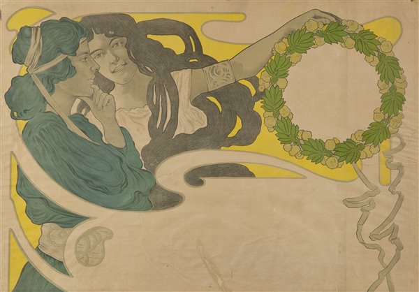 | Note | Il bozzetto, relativo probabilmente alla parte superiore di un manifesto, riprende i principali tratti distintivi dell'Art Nouveau, con uno sguardo particolare rivolto al secessionista Alphonse Mucha i cui lavori spesso raffigurano giovani donne in abiti dal taglio neoclassico, circondate da motivi floreali che formano cornici geometriche attorno alla figura. L'opera, attribuibile ad Antonio Bauzon, mostra due giovani fanciulle, una delle quali sostiene una corona fiorita. Bozzetto per manifesto generico, realizzato dai disegnatori dello Stabilimento Passero Chiesa decorandone una parte - solitamente gli argini a creare una sorta di cornice - lasciando liberi degli spazi che venivano redatti in secondo tempo con appositi testi, a seconda della loro destinazione (spettacoli teatrali, operistici, manifestazioni artistiche, etc.) dagli acquirenti dell'affiche. Il prototipo adottato in questa ed in altre affiche realizzate per manifestazioni culturali è infatti quello più "convenzionale", con ampio spazio per le scritte - nomi, luoghi e, dettagliatamente specificate le varianti del costo di eventuali biglietti - e le decorazioni relegate alla funzione di cornice allegorica. |