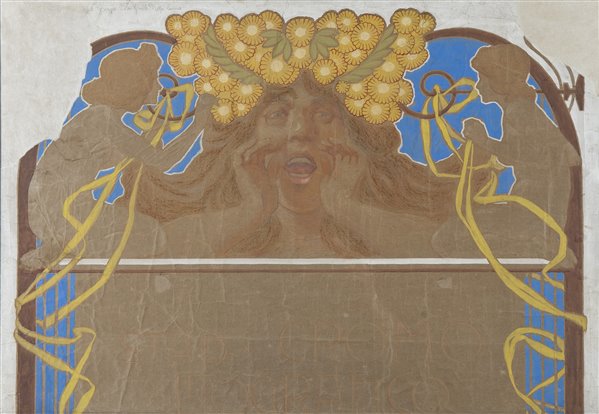 | Note | Il bozzetto, relativo probabilmente alla parte superiore di un manifesto, riprende i principali tratti distintivi dell'Art Nouveau, con uno sguardo particolare rivolto al secessionista Alphonse Mucha i cui lavori spesso raffigurano giovani donne in abiti dal taglio neoclassico, circondate da motivi floreali che formano cornici geometriche attorno alla figura. L'opera, attribuibile ad Antonio Bauzon, mostra il volto di una donna che, portandosi le mani ai lati della bocca spalancata, sembra chiamare o dire qualcosa ad alta voce, nella tensione dinamica di un'azione colta nel suo svolgersi. L'insolita posa della donna raffigurata nel bozzetto potrebbe rifarsi ad alcuni bronzetti minoici che, insieme a terrecotte e ceramiche, invadevano le esposizioni artistiche dell'epoca e che il Bauzon avrebbe potuto vedere anche a Trieste. Alcuni di essi, infatti, riproducono una figura femminile nello stesso atteggiamento, protesa e con le mani attorno alla bocca schiusa (agli stessi modelli protostorici attingerà in seguito, negli anni '30, lo scultore Marcello Mascherini per l'esecuzione di "Estate"). Anche per questo, come per altri bozzetti del fondo Chiesa eseguiti dal Bauzon (nn. FC 319-326-327-333-337), è possibile ipotizzare una finalità di divulgazione di eventi o manifestazioni culturali. Il prototipo adottato in questa ed in altre affiche realizzate per manifestazioni culturali è infatti quello più "convenzionale", con ampio spazio per le scritte - nomi, luoghi e, dettagliatamente specificate le varianti del costo di eventuali biglietti - e le decorazioni relegate alla funzione di cornice allegorica. |