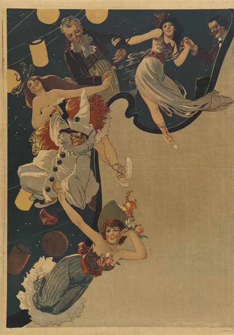 | Note | Manifesto generico realizzato per spettacoli, rappresentazioni teatrali o, ancora più probabile, per feste o veglioni di carnevale. Il carnevale viene tratteggiato e descritto dallo Stabilimento Passero agli inizi del Novecento, avvalendosi del modello del manifesto lirico dalla classica cornice decorativa a “cartiglio”, per giungere in seguito ad elaborazioni figurative più libere e complesse in cui alle figure raffinatamente mascherate si avvicendano buffi personaggi, burattini stralunati che, come nel manifesto realizzato da Piero - Antonio Sencig per il Gran Veglione Eneo del 1928. In quest'affiche uomini e donne in maschera danzano in un cielo illuminato dalle stelle e da suggestive luminarie che ricordano le tradizionali lampade giapponesi. Una sinuosa cornice liberty separa la gioiosa comitiva da uno spazio sgombro da testo o immagini. Nel momento in cui il manifesto verrà acquistato, in tale spazio sarà posto un testo contenente titolo e varie altre informazioni relative alla manifestazione, solitamente di natura culturale, da promuovere. |