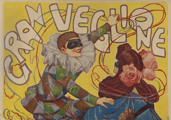 | Note | Il Carnevale si è sviluppato poi spontaneamente nella società umana, rivestendo sempre un’importanza fondamentale al suo interno e nel suo immaginario collettivo: la fantasia, l’energia, la spontaneità e le creatività hanno trovato espressione, fin dai tempi passati, in questo evento, la cui portata simbolica va ben al di là della semplice festa. Non stupisce quindi che tanta fantasia e cretività si ritrovino anche negli innumerevoli affiches, tra la fine dell'800 e i primi decenni del '900, raccontano il carnevale nelle sue molteplici forme. In questo manifesto o, più propriamente, parte superiore di manifesto, sono raffigurati un uomo ed una donna, entrambi mascherati, in un vortice di danze e stelle filanti. Il soridente arlecchino cinge con filanti e colorati addobbi la dama di spalle che pare indossare una sorta di kimono dalle tipiche decorazioni floreali. Perfettamente integrata nella composizione, in una giocosa conversazione con le sinuose stelle filanti, l'imponente scritta "Gran Veglione" che, con molta probabilità, dà una precisa indicazione sulla destinazione del manifesto, un veglione od una festa da ballo. Confrontando quest'opera con il manifesto "Maschere" (n. FC305 ), si nota in "Gran Carnevale" una minor aderenza alla sinuosità e alla raffinatezza delle forme proprie del Liberty - stile a cui il cartellonismo di inizi '900 attinse appieno - che invece si scorgono nelle figure avvolte da rose del manifesto, anch'esso anonimo, di precedente datazione. |
