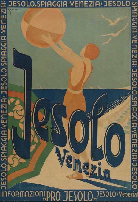 | Note | Nato a trieste il 6 luglio 1875 ed attivo nella città giuliana nei primi anni del '900, Sencig (poi Senci) si dedica soprattutto alla grafica applicata alla cartolina e a varie forme di ricorrenza o pubblicità come locandine o manifesti. Disegna per la Lega Nazionale, per la Festa del Grillo. Nel 1923 si trasferisce definitivamente a Udine ed avvia un rapporto di collaborazione con lo Stabilimento Passero-Chiesa di cui diviene il principale disegnatore "interno" conseguendo un'attività cartellonistica di un certo spessore. Si esprime con una grafica di ascendenza austriaca fatta di solido e brillante naturalismo che porta negli anni '20 ad una dimensione più popolare e a tratti fumettistica. L'artista si evolve poi verso una stilizzazione che negli anni '30 si impregna di novecentismo e raggiunge esiti di esasperata geometrizzazione. Muore a Udine il 2 novembre 1952. Jesolo, località promossa in questo manifesto, vive una nuova fase della propria storia con i grandi lavori di bonifica che, avviati nel XIX secolo, riprendono nell'immediato primo dopoguerra ottenendo grandissimo sviluppo soprattutto tra il 1920 e il 1930. La rinascita agricola coincide con la "riscoperta" della località marina: a poco a poco la gente ritrova il suo mare apprezzandone i benefici curativi, attratta sempre più da un nuovo e irresistibile fascino. Vi arriva nei giorni festivi a piedi, in bicicletta o in diligenza: una carretta imbandierata e trainata da uno o due cavalli a far servizio pubblico dal centro del vecchio paese, dove giungono poche corriere dai paesi vicini. Nel 1930 il Comune riprende l'antico nome di Jesolo (prima Cavazuccherina) che nel 1936 viene esteso al vicino Lido. Intanto, dapprima attraverso istituzioni ospedaliere e colonie per bambini si va incrementando la ricettività balneare della zona, nascono i primi stabilimenti per le cure elioterapiche a cui fanno seguito negli anni '30 alberghi con ristoranti. In questa magica cornice prende vita la figura di giovane donna che, a piedi nudi sulla finissima sabbia dolomitica, gioca con un grande pallone da spiaggia in riva al mare. Il paesaggio marittimo tratteggiato con poche linee a creare campiture di colore - azzurro il cielo, blu il mare ed ocra la sabbia - fa da sintetica scenografia alla donna ed alla verde tela di un ombrellone in primo piano. Impressa come a il mare ed ocra la sabbia - fa da sintetica scenografia alla donna ed alla verde tela di un ombrellone in primo piano. Impressa come a suggellare il racconto, foriero di spensieratezza e vivacità, la scritta che riporta il nome della località in un lettering morbido ed imponente, blu come il triangolo di mare oltre l'asciutta figura femminile. In questo manifesto Sencig riprende un'iconografia frequente nella promozione di stazioni balneari (si vedano, ad esempio, Grado di Marcello Dudovich del 1933 e Lignano Sabbia d'Oro, di autore anonimo, stampato dallo Stabilimento Passero di G. Chiesa nel '36 in AA. VV., 150 manifesti del Friuli - Venezia Giulia. Vita e costume di una regione 1895-1940, Padova, 1982, p. 59 e p. 70 o le radiose bagnanti disegnate da Filippo Romoli, cartellonista genovese attivo dagli anni '30 agli anni '60 in AA.VV., Catalogo Bolaffi del Manifesto Italiano, Giulio Bolaffi Editore, Torino 1995). |