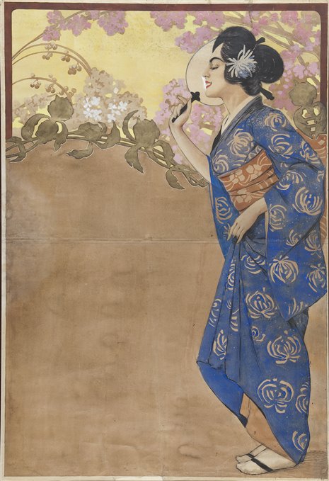| Note | Dalla metà del XIX secolo si afferma in Europa il Japonisme, fenomeno culturale caratterizzato dalla produzione di dipinti, sculture, spettacoli, moda e arti decorative influenzate in vario modo dell'arte del Giappone. L'affermazione del giapponismo viene stimolata dall'apertura commerciale e politica del paese del Sol Levante tra 1854 e 1858, dopo un lungo e rigido isolamento. In Occidente arrivano gli ukiyo-e ('immagini del mondo fluttuante'), stampe legate alla cultura ukiyo avidamente collezionate da intellettuali, mercanti d'arte e, naturalmente, artisti che hanno un impatto decisivo sulla pittura e sull'illustrazione litografica, stimolando quegli artisti che, insofferenti alle convenzioni della pittura accademica, cercano nuove possibilità espressive. Attinge al giaponismo anche l'Art Nouveau - Liberty in Italia - che coniuga l'accentuato linearismo e l’eleganza decorativa ad un'inedita resa spaziale e all'accesa tavolozza che contraddistingue l'arte nipponica. Il bozzetto di Antonio Bauzon raccoglie tali suggerimenti, la bidimensionalità della figura, che l'artista mette maggiormente in rilievo ponendola di profilo, ed un certo contrasto cromatico tra il blu cobalto del kimono ed i tenui colori del beige e del rosa che fanno da sfondo e, in una cornice floreale che riprende gli stilemi tipici dell'Art Nouveau. Da Dudovich prende invece e la malizia e quella vezzosità che caratterizzano le figure feminili del suo concittadino, rendendole però più manierate e cristallizzate in pose obbligate. Si noti che la donna, seppure vestita ed acconciata con il tradizionale costume nipponico, è occidentale, forse un riferimento alla diffusa abitudine di molte signore della borghesia "illuminata", clienti delle botteghe d'arte, che amavano farsi ritrarre in costumi giapponesi. Il soggetto di questo bozzetto si ritrova in alcuni manifesti, in prevalenza destinati alla promozione di opere liriche e spettacoli (si veda, ad esempio, il manifesto eseguito per la Ricordi dal triestino Leopoldo Metlicovitz in occasione dell'opera di Giacomo Puccini Madama Butterfly - Mughini G., Scudiero G., Il manifesto pubblicitario italiano, Nuova Arti Grafiche Ricordi, Milano 1997). Il prototipo adottato in questa ed in altre affiche realizzate per manifestazioni culturali è quello più "convenzionale", con ampio spazio per le scritte - nomi, luoghi e, dettagliatamente specificate le varianti del costo di eventuali biglietti - e le decorazioni relegate alla funzione di cornice allegorica. |