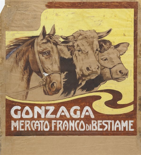 | Note | Il bozzetto, che mostra due bovi ed un cavallo che si affacciano da una timidamente accennata cornice in stile liberty, intende promuovere il mercato franco di bestiame allestito in occasione della Fiera Millenaria di Gonzaga, in provincia di Mantova, appuntamento di rilevanza nazionale che richiama allevatori e agricoltori da ogni parte della penisola. La nascita della Fiera Millenaria risale al 1448, anno in cui si verificò un evento miracoloso che coinvolse Francesco II Gonzaga, il quale, sbalzato malamente da un cavallo imbizzarrito sulla via per Reggiolo, rischiò di ferirsi gravemente o peggio. Grato alla Madonna per lo scampato pericolo, il Marchese volle dedicare un giorno di festa alla Vergine individuandolo nell'8 settembre, festa della natività di Maria, celebrandola con il commercio di beni senza pagamento di gabelle e dazi attorno al convento. Da quel giorno ogni anno si tenne un'apposita fiera di merci e divertimenti per il popolo, anche se va detto che ben prima di quell'anno a Gonzaga il giorno della Natività della Madonna si correva il palio. E' evidente come un appuntamento sportivo così importante dovesse svolgersi nel contesto della manifestazione più ampia, accompagnata da banchi di mercanti e venditori di qualsiasi genere. Si noti, nell'angolo superiore destro del manifesto, disegnato con un leggero tratto di matita, lo stemma del Comune di Gonzaga. Si può inoltre osservare, nelle tre teste di animali in primo piano, una certa analogia con il manifesto ideato da C. Todaro in occasione della Grande Fiera di Cavalli organizzata nella città di Udine (vedi manifesto n.) |