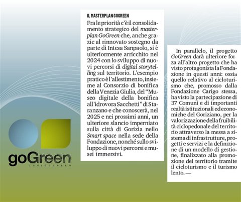Va in questa direzione il consolidamento strategico del masterplan goGreen, che anchegrazie al rinnovato sostegno da parte di Intesa Sanpaolo si è ulteriormente arricchito nel 2024 con lo sviluppo di nuovi percorsi di digital storytelling sul territorio, con l’allestimento, insieme al Consorzio di Bonifica della Venezia Giulia, del Museo Digitale della Bonifica all’Idrovora Sacchetti di Staranzano, e che conoscerà nel 2025, e nei prossimi anni, un ulteriore slancio focalizzato sulla città di Gorizia nello Smart Space nella sede della Fondazione, nonché sullo sviluppo di nuovi percorsi e musei immersivi.