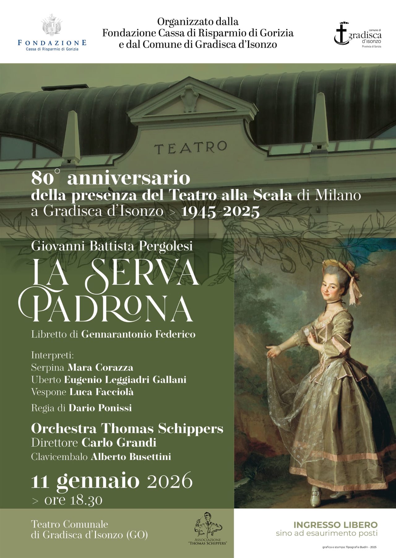 La Fondazione Cassa di Risparmio di Gorizia e il Comune di Gradisca d’Isonzo sono lieti di annunciare un evento speciale dedicato a una pagina straordinaria della storia culturale del territorio. L'iniziativa nasce per celebrare l’80° Anniversario della presenza del Teatro alla Scala di Milano a Gradisca d’Isonzo. Il momento clou si terrà domenica 11 gennaio 2026, alle ore 18.30, quando il Teatro Comunale di Gradisca d’Isonzo ospiterà la messa in scena dell’opera buffa “La Serva Padrona” di Giovanni Battista Pergolesi.