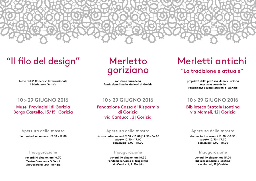 Non mancheranno le manifestazioni collaterali. La mostra “Merletto goriziano”, a cura della Fondazione Scuola Merletti di Gorizia, sarà inaugurata il 10 giugno, alle 16.30, nella sede della Fondazione Cassa di Risparmio di Gorizia, e si potrà visitare fino al 29 giugno (da martedì a venerdì dalle 9.30 alle 13 e dalle 14.30 alle 16, il sabato dalle 10.30 alle 13 e la domenica dalle 15 alle 18).