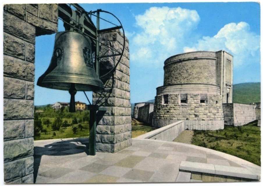 NOTE | Sul verso: titolo; titolo parallelo "Sacrarium von Oslavia (60.000 Gefallenen/ 1915-18)/ Votif-Glocke, von den Italienern gestiftet/ Lieu sacré d'Oslavia (60.000 soldats tombés/ 1915-18)/ Cloche votive offerte par les Italiens/ Sacrarium of Oslavia (60.000 fallen soldiers/ 1915-18)/ Votive clock offered by the Italian People".; "n. 219 - Fotoedizioni G. Lazzaro - Gorizia; "Stab. Grafico Cesare Capello - Milano"; da Fotocolor [logo] Kodak Ektachrome". Cartolina non viaggiata. La campana votiva venne collocata il 4 novembre 1959. |