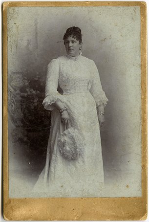 Soggetto | Amalia Fillak ritratta in abito bianco e con in mano un ventaglio di piume di struzzo, in atelier |