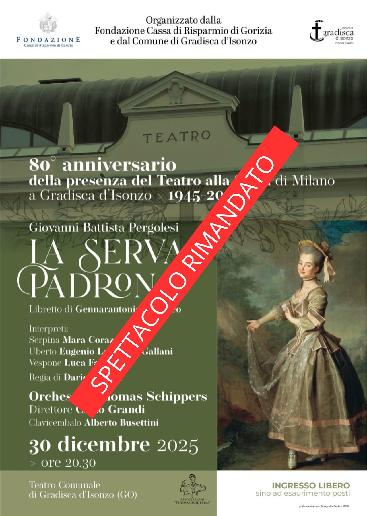 Si comunica che, a causa di uno stato influenzale del soprano cantante protagonista, sia la messa in scena dell'Opera "La Serva Padrona", in programma martedì 30 dicembre 2025 al Teatro Comunale di Gradisca d'Isonzo, sia la prova aperta al pubblico di lunedì 29 dicembre, sono RIMANDATE A DATA DA DESTINARSI.